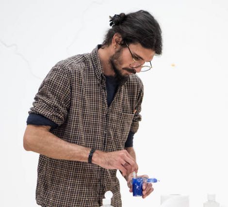 Image: D Harding installing Wall Composition in Reckitt’s Blue 2017 / Commissioned 2017 with funds from anonymous donors through the Queensland Art Gallery | Gallery of Modern Art Foundation Australian Art Collection, Queensland Art Gallery, 2017/ Photo credit: Chloë Callistemon, Queensland Art Gallery | Gallery of Modern Art