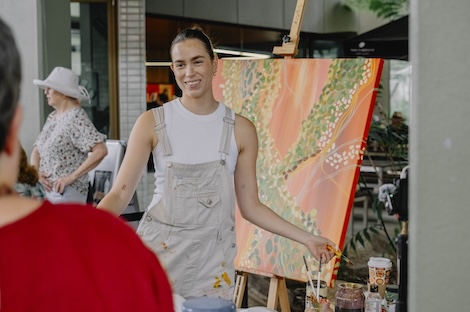 During the 50 Years of Griffith event, emerging Aboriginal artist from the Wulli Wulli people, Arabella Walker, created an artwork inspired by the milestone, the community, and her Griffith student experience. It is displayed at the Library, Brisbane South (Nathan).