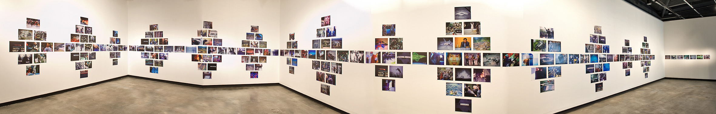 The World is another huge unique, morphing work, made up of thousands of photographic units. It can be shown in various places at once, across vast geographical distance, and has endless variations, never the same as any previous incarnation. For Griffith University Art Gallery, 215 photographs have been selected by the artist from her repository, just as another manifestation of The World take shape for exhibition in October at The London School of Fashion Gallery. The World is as much a conceptual visual system as it is an art work, and in Brisbane it has been installed around the gallery as a series of linked glyphs, each in the form of a large lozenge, or diamond shape. Each image, and the repeated lozenge forms that contain them, alludes to a key concept which underpins The World; that of the principle of simultaneity.