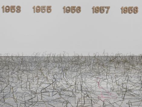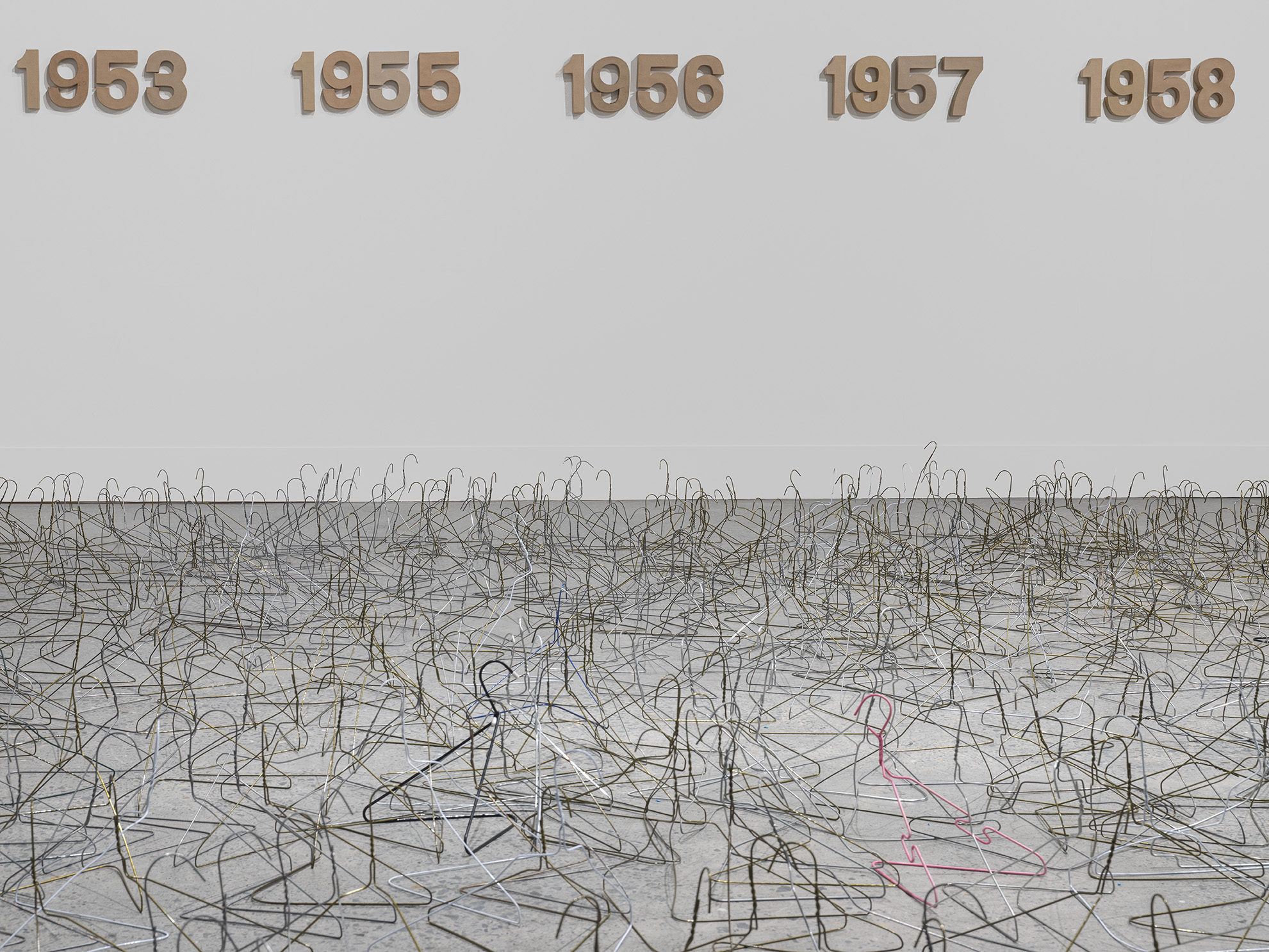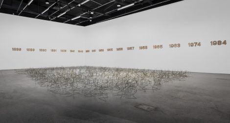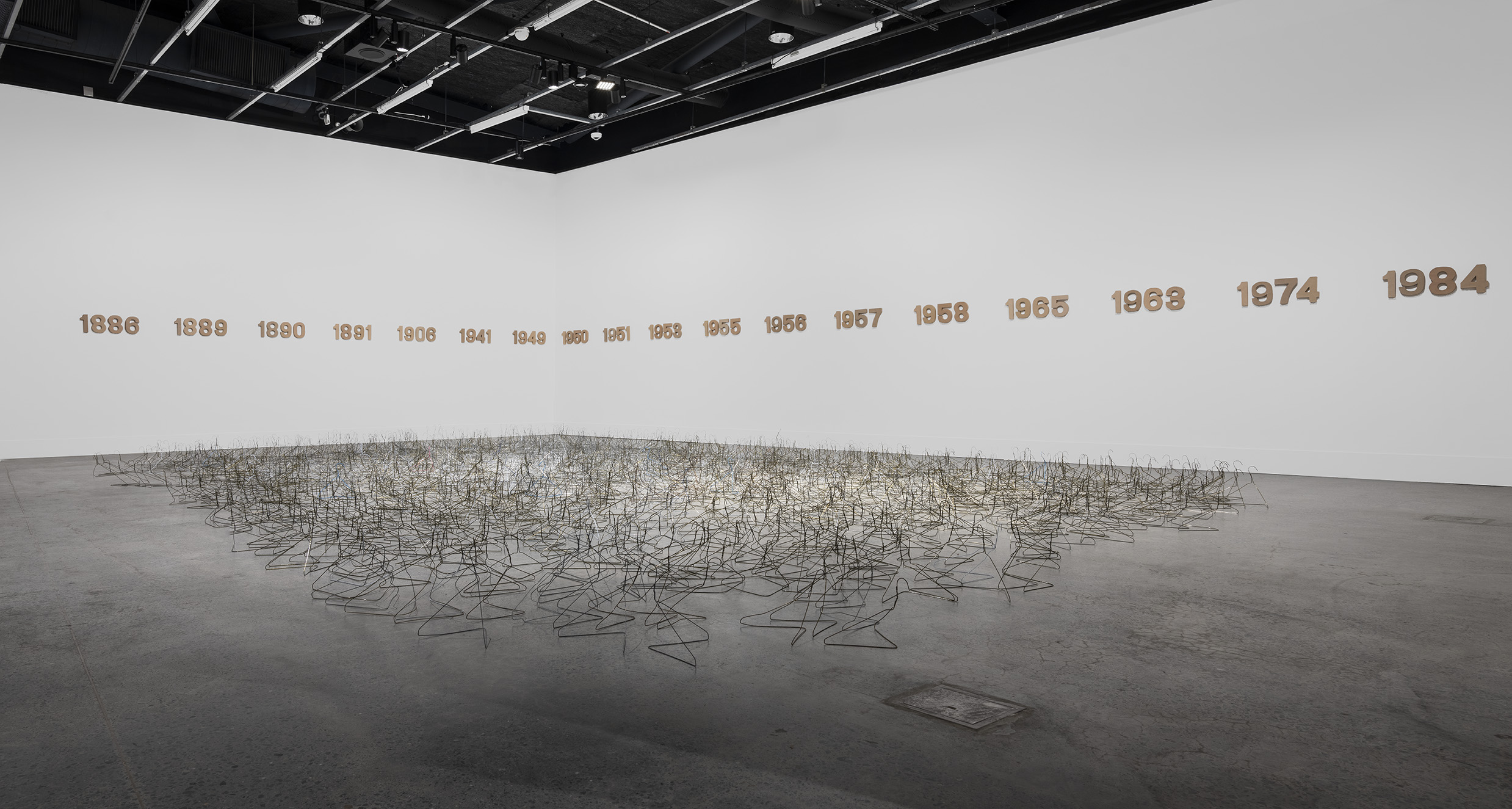 “PELICAN DREAMING: 18 FROG POEMS, FOR GREG C.” 1984-2020. Wire coat hangers and papier-mâché numbers. Installation view, Griffith University Art Museum, Brisbane, December 2020. Griffith University Art Collection. Donated through the Australian Government's Cultural Gifts Program by an anonymous donor, 2021. Courtesy of the artist, and Yuill Crowley, Sydney. Photo: Carl Warner