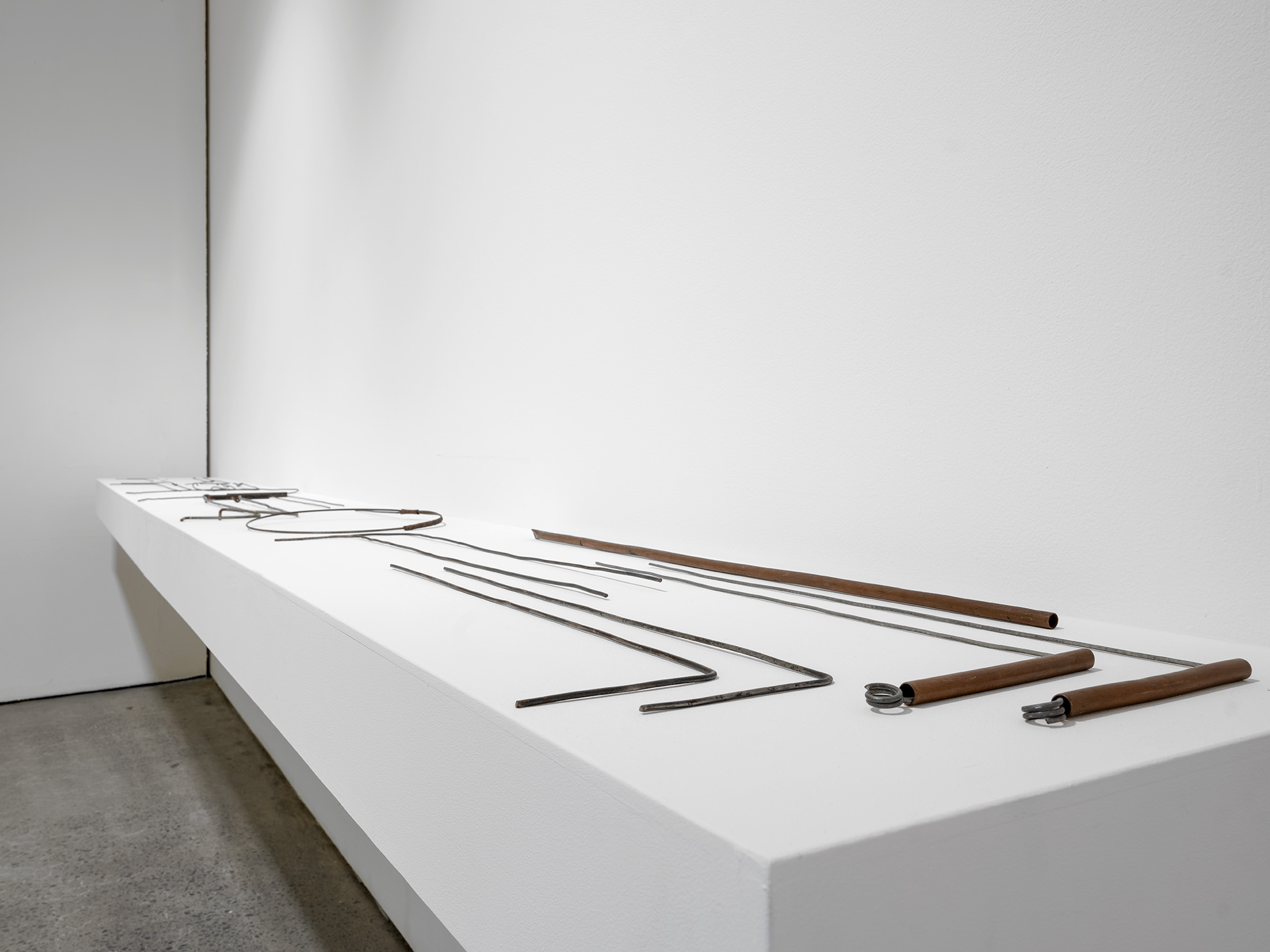MacPherson is deeply interested in the ways language creates systems of knowledge, and how objects might be designated as art. In the first room we see the artist’s personal collection of elegant water divining tools, used in the practice of dowsing or ‘water witching’ to locate groundwater. Each tool is dedicated to a figure from MacPherson’s personal history.