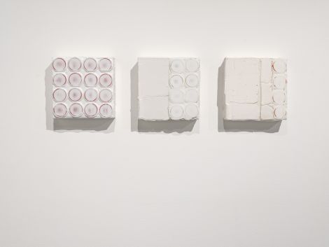 MacPherson’s ‘Frog Poems’ series involves the conjunction of objects with forms of language and classification, in this case papier-mâché dates indicate records of Kati Thanda-Lake Eyre’s flooding within the recent settler past.