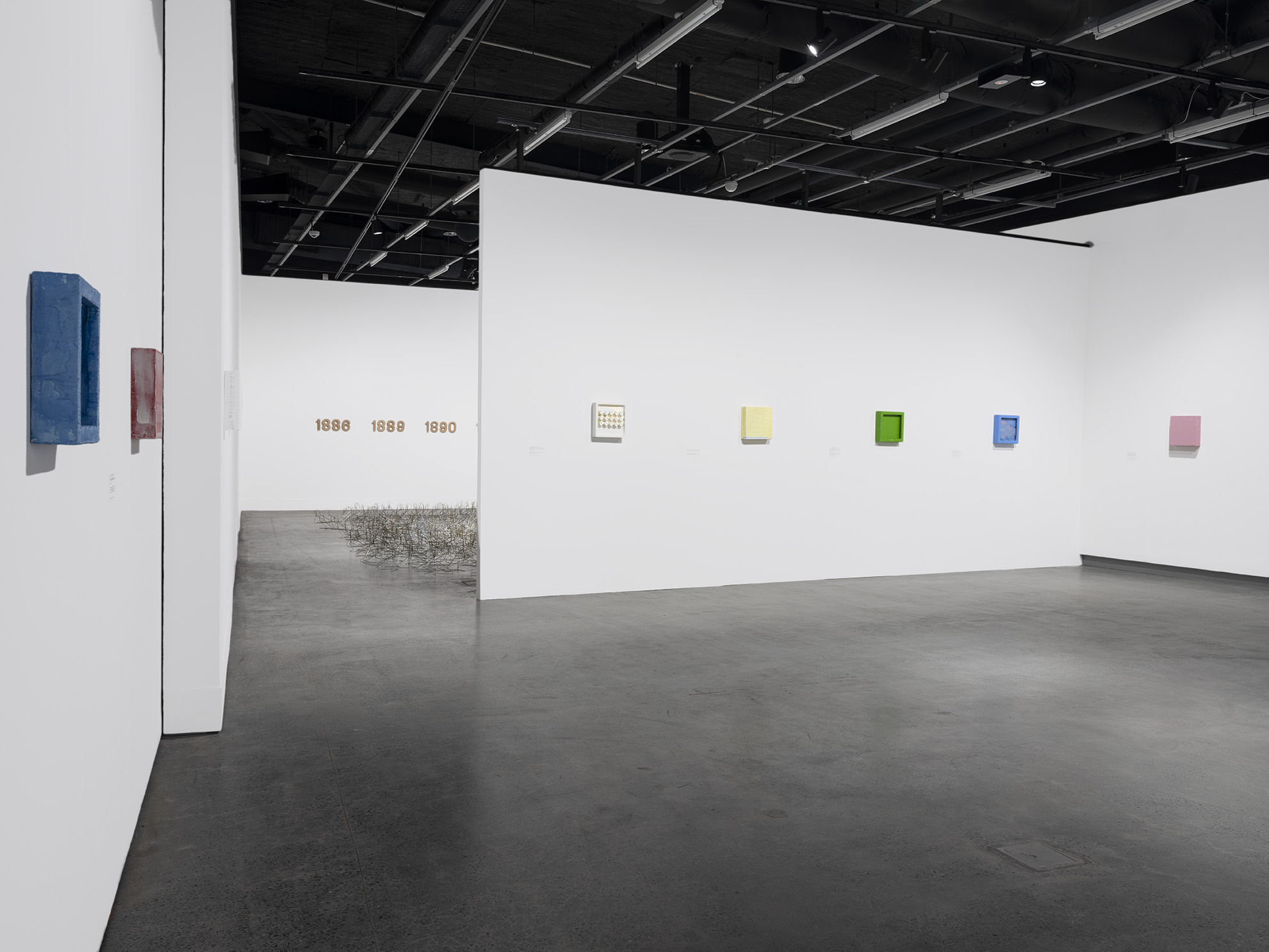 - “PELICAN DREAMING: 18 FROG POEMS, FOR GREG C.” 1984-2020. Wire coat hangers and papier-mâché numbers. Installation view, Griffith University Art Museum, Brisbane, December 2020. Griffith University Art Collection. Donated through the Australian Government's Cultural Gifts Program by an anonymous donor, 2021. Courtesy of the artist, and Yuill Crowley, Sydney. Photo: Carl Warner