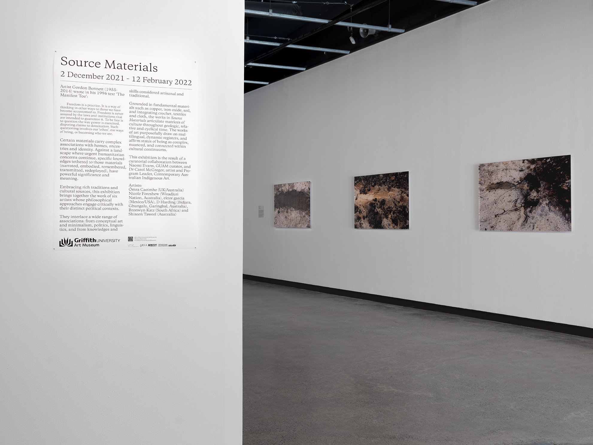 Source Materials brings together six artists who share philosophical approaches to time and transcultural practice. Working from distinct cultural and political contexts, multidisciplinary artists Ómra Caoimhe (UK/Australia), Nicole Foreshew (Wiradjuri Nation, Australia), Ektor Garcia (Mexico/USA), Dale Harding (Bidjara, Ghungalu, Garingbal, Australia), Bronwyn Katz (South Africa) and Shireen Taweel (Australia) draw from traditional practices as well as post-minimal and conceptual art theories to present new ways of reading and thinking about art that identify breaches rather than continuums of culture.