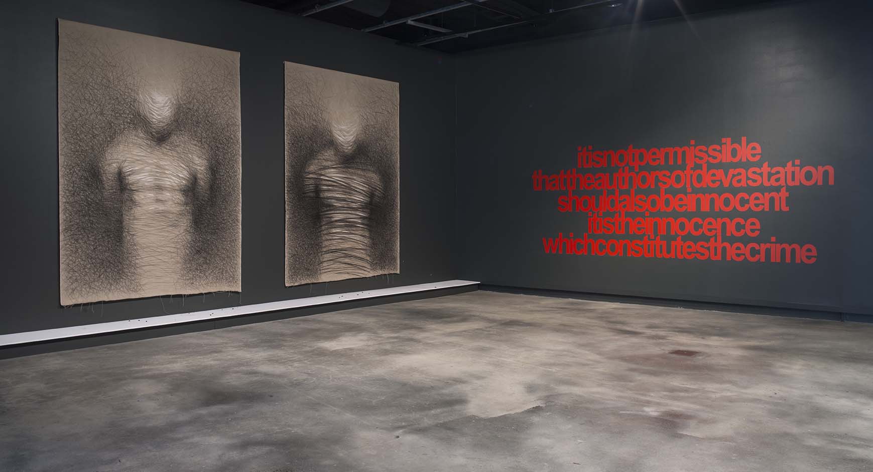 A group of recent works in diverse media by Vernon Ah Kee includes the paintings brutalities (triptych) 2014 and the text work authorsofdevastation 2015 as well as two new drawings lynching 1 and lynching 2 2015 made in situ on raw Belgian linen.