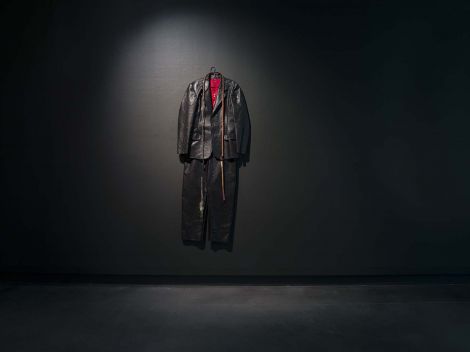 The earliest works in this exhibition are by the late Gordon Bennett, who has been at the forefront of contemporary Australian art for the last three decades for his interrogations of identity, culture, history and language. Bennett’s seminal video work Performance with Object for the Expiation of Guilt (Apple Premiere Mix) from 1995 is accompanied by related objects – a suit made from painted canvas tailored to the artist’s body, a stock whip and the painted object seen in the video, also made to the artist’s dimensions.
