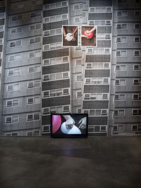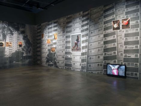 Destiny Deacon and Virginia Fraser’s Snap out of it 2014 presents images of towering public housing flats in Melbourne covering the gallery walls. Deacon’s signature photographic vignettes with dolls and family members are placed against an environment of brutalist architecture that has become internationally synonymous with disadvantage and failed utopian ideals. The accompanying silent video is both comical yet suggestive of tension and breaking points.