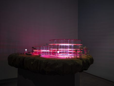 Architecture Makes Us brings together several key works across a ten year period by Melbourne-based Australian artists Sonia Leber (b.1959) and David Chesworth (b.1958), exploring craggy geographies, territorialisation, surveillance, exhausted systems and future philosophies.