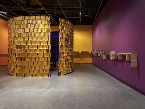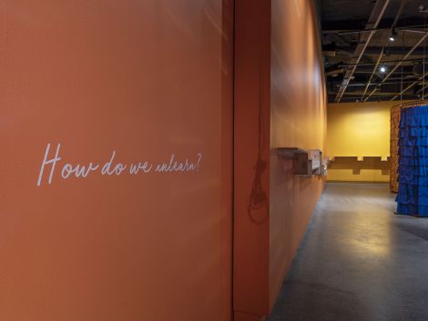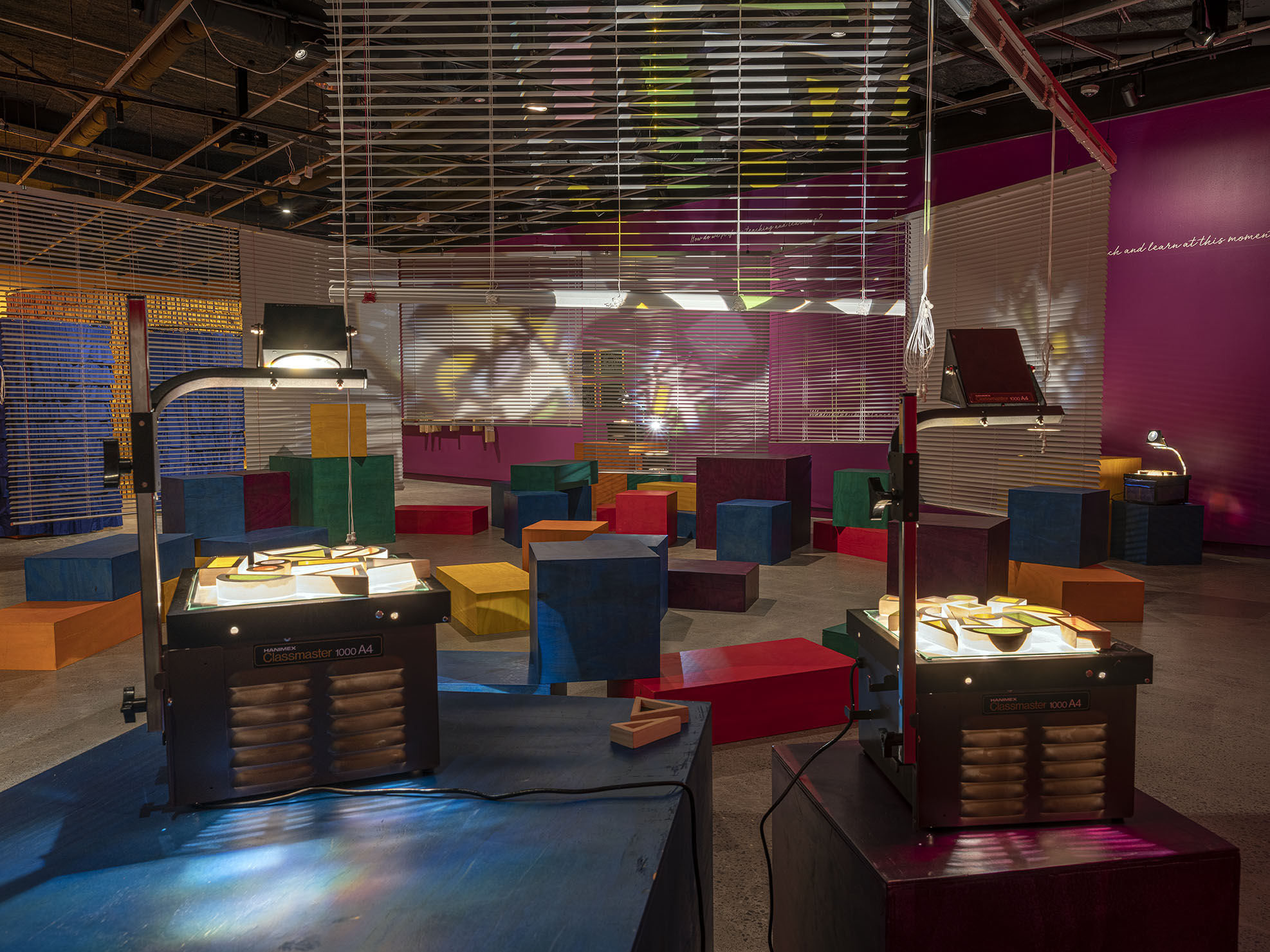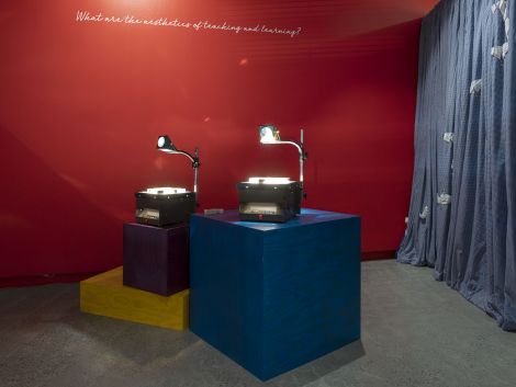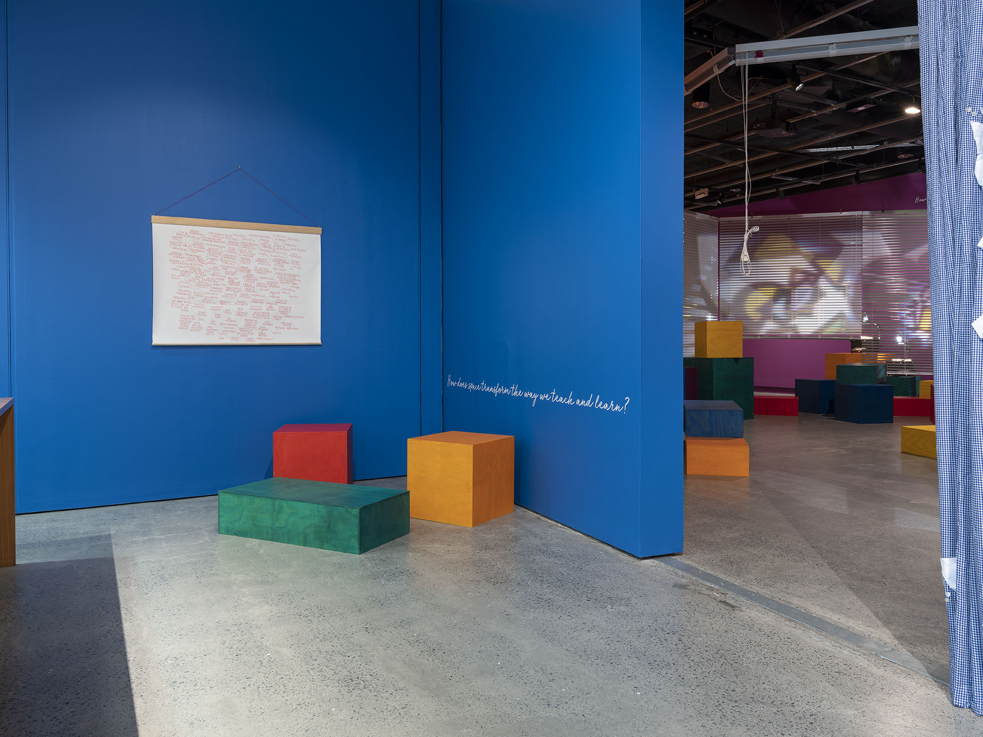 Familiar classroom tropes such as chalkboards, uniforms, and venetian blinds transform the gallery into a school about schools. Drawing on Johann Wolfgang von Goethe’s colour theory adopted by educator Rudolf Steiner in his classroom design, de Souza explores how space and colour can transform the way we teach and learn. Enlarged building blocks suggest designs by the founder of kindergarten Friedrich Fröbel, and a library wraps around the gallery walls with books that prioritise marginalised voices within education.