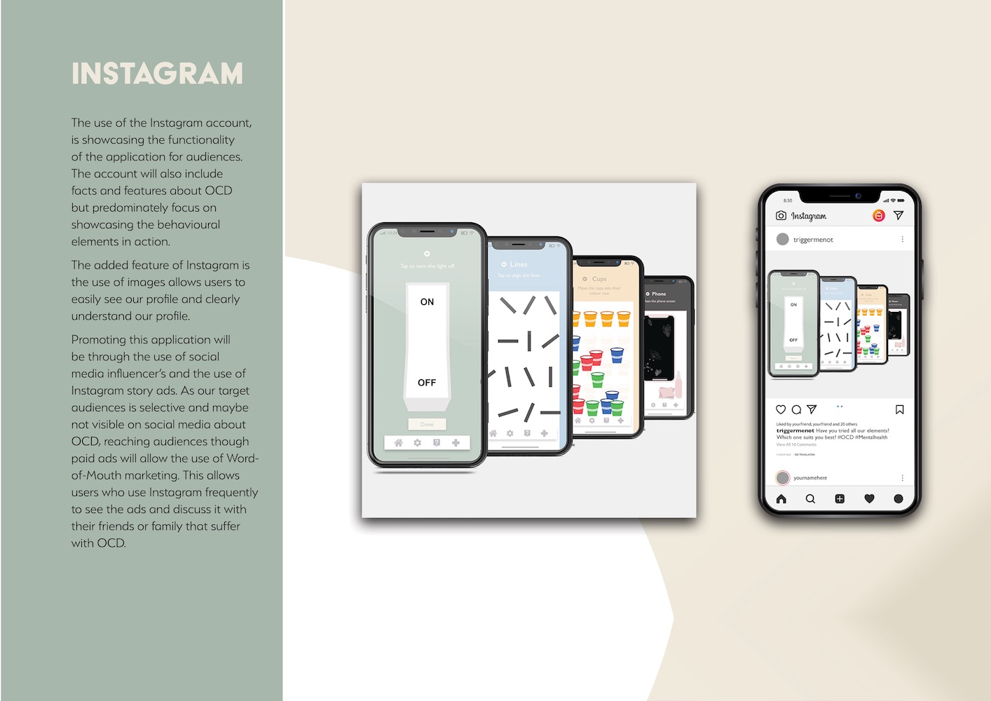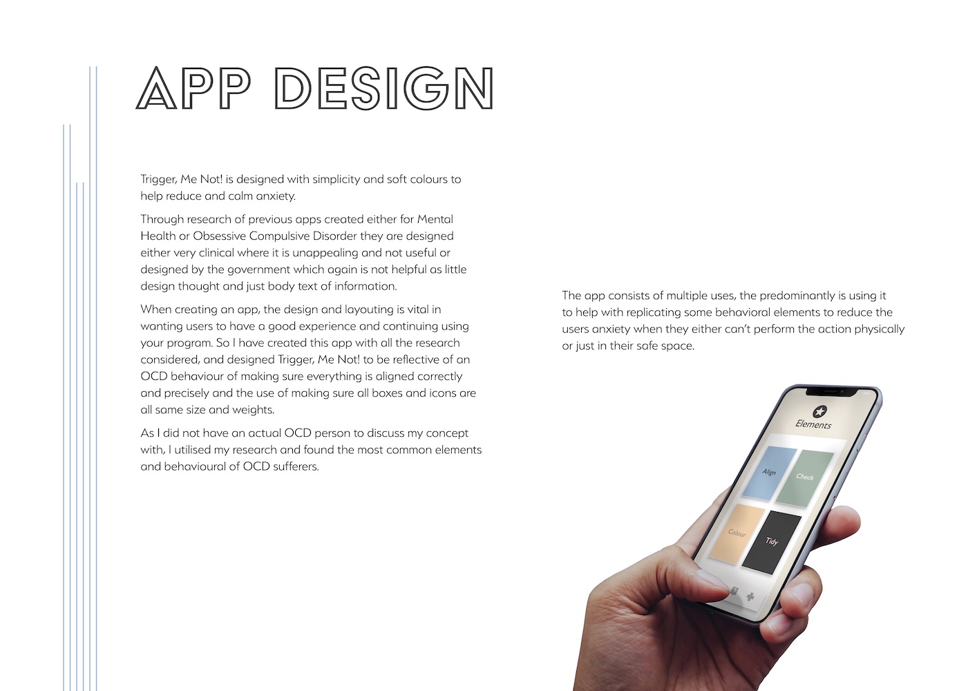 For my final piece of assessment, I wished to create an app that would be beneficial to the community and to raise awareness. The app Trigger, Me Not! is designed for people suffering with Obsessive Compulsive Disorder. It is designed to create a sense of comfort for the sufferers, through the use of their phones, by replicating common behavioural elements.