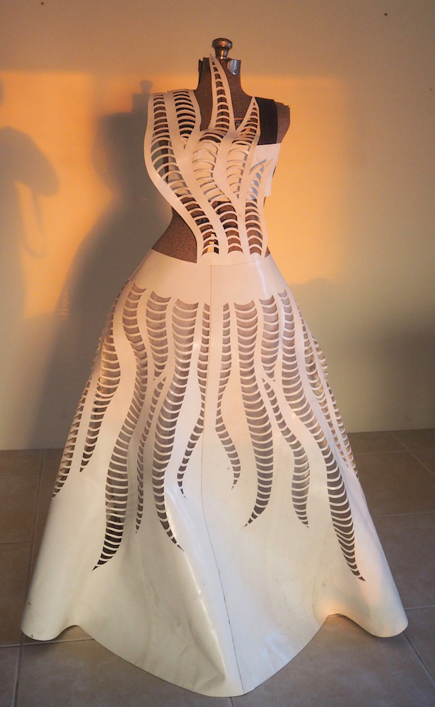 Focusing on sustainability; I have designed a light installation from recycled lampshades, toilet paper rolls and biodegradable twine. I have also designed a couture gown from recycled truck curtains, the detailing on the gown was water-jet cut and features a mesmerising, jellyfish like pattern.