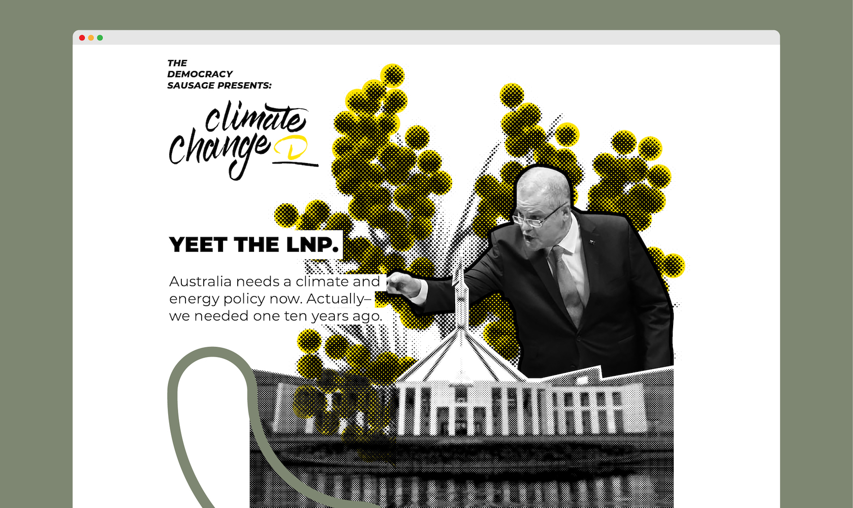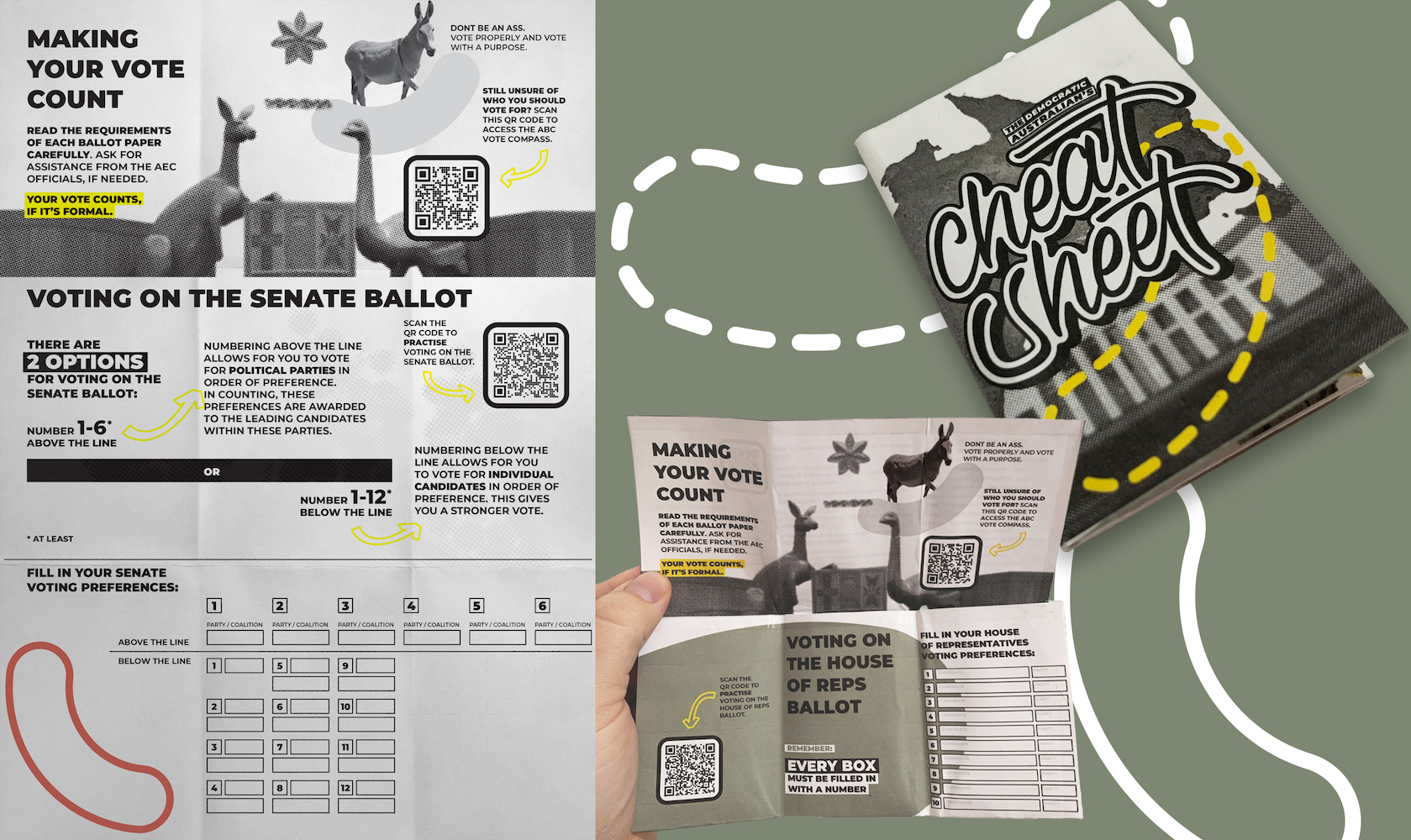 Already, researchers have identified a global trend amongst millennials showing a rapid decline in the interest of democracy, citing a lack of attachment to the importance of voting. Research has shown that people who understand the system, are able to access and engage with the system. Conducted under an action research approach, this project seeks to develop a two-pronged campaign addressing the education of democracy in Australia, and the ability to impact positive climate action, through the use of visual communication and design outcomes, in order to promote an understanding of Australian democracy.