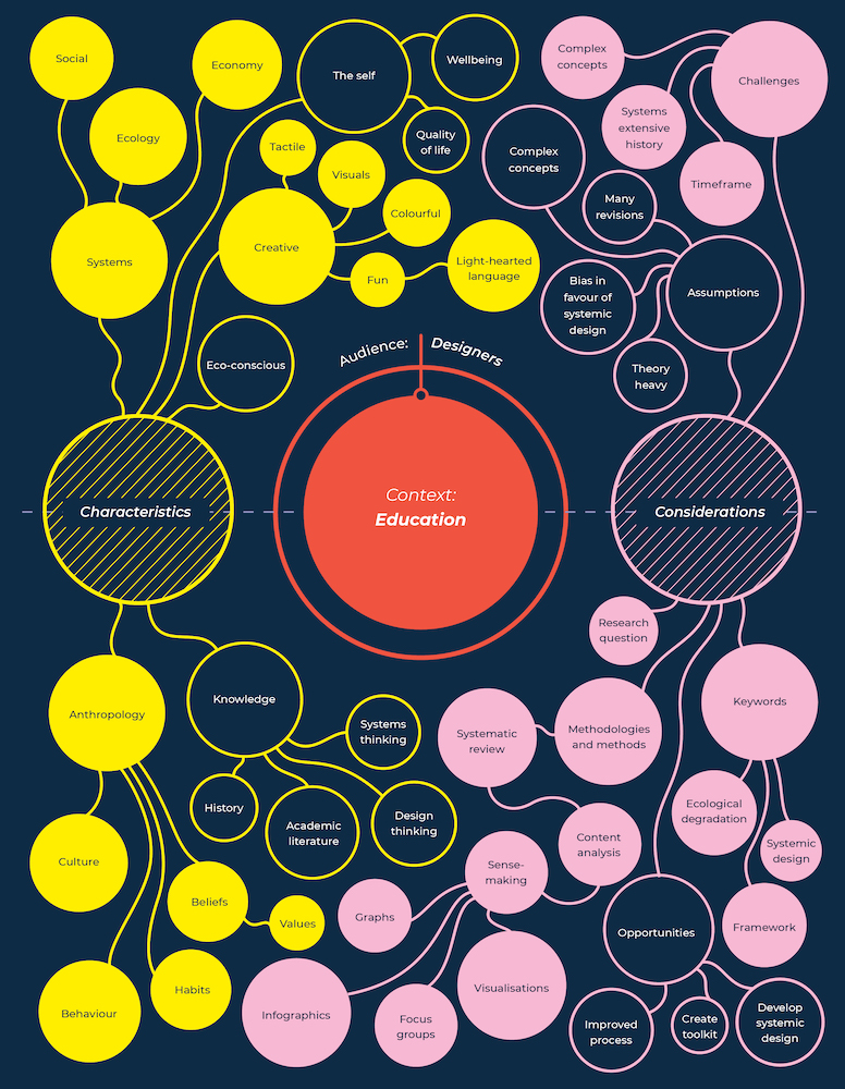 The intention of this project was to conduct a systematic review to examine current systemic design literature in order to synthesise and unearth a potential framework. The research conducted for the purposes of this project aimed to establish and understand how systemic design can support designers in approaching complex challenges. A variety of sensemaking tools were used to document and comprehend the themes presented in the literature, including concept mapping, infographics and radial convergence maps. The research findings led to and informed the creation of a systemic design toolkit, aimed at providing designers from all disciplines with a framework that facilitates a deeper understanding of the impact design has on everyday life, sociocultural factors and the ecosystem.