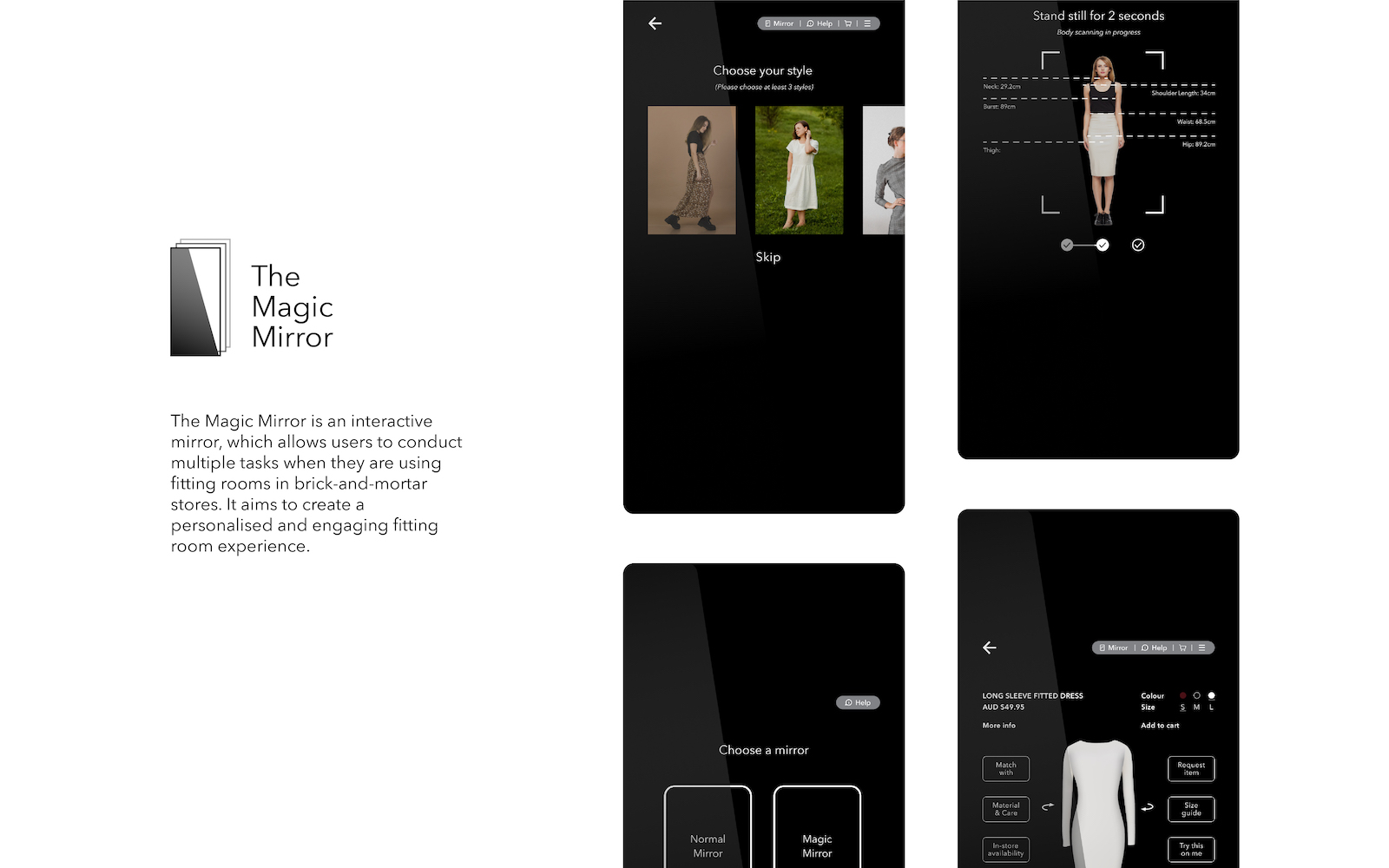 The Magic Mirror project is a practice-based study that aims to explore how digital technology can amplify a positive fitting room experience as part of the overall shopping experience of Australian consumers. The findings revealed that the majority of the participants were interested in using fitting rooms that incorporate digital technology. The suggested useful features of digital technology are accessibility to a variety of information (stock availability, caring tips, size guide), style recommendations based on preferences using Artificial Intelligence (AI), and a navigation element that enables customers to easily seek help from sales assistants in the fitting room. Therefore, a smart interface will be designed as a form of interactive mirror, offering users necessary information and style recommendations, as well as conveniently seek assistance with the touch of a button.