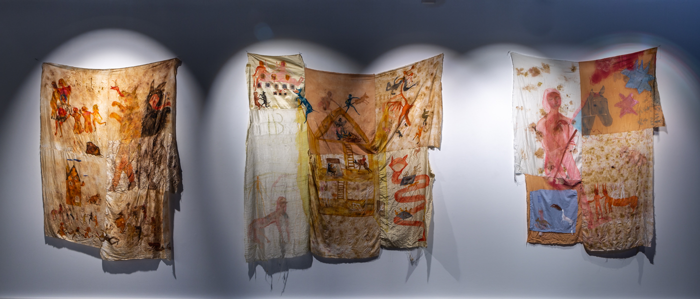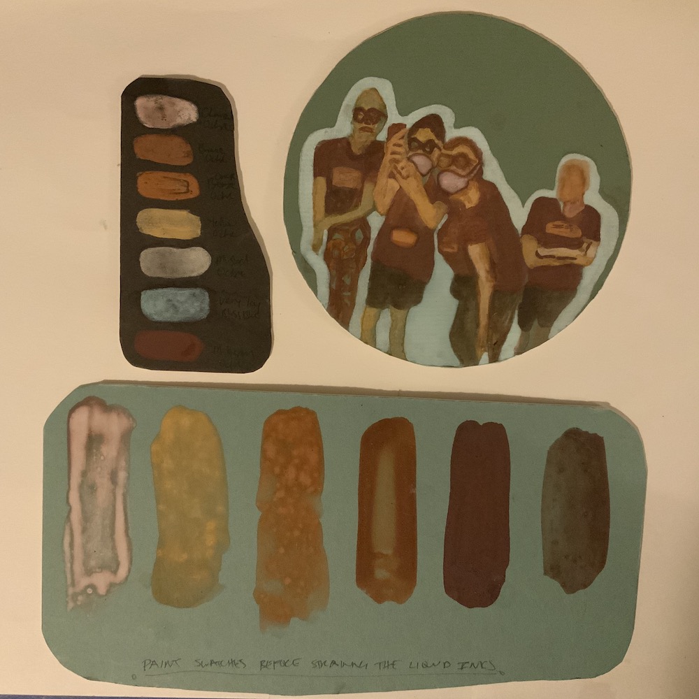 The three works are part of a larger series of collage, watercolour and ink paintings, oil on canvas and board paintings and photographs telling the story of a person surviving stormy seas and arriving at an imaginary island. It is a celebration of being alive; of exploring nature; of encountering the banksia people and discovering a sense of belonging and kinship.