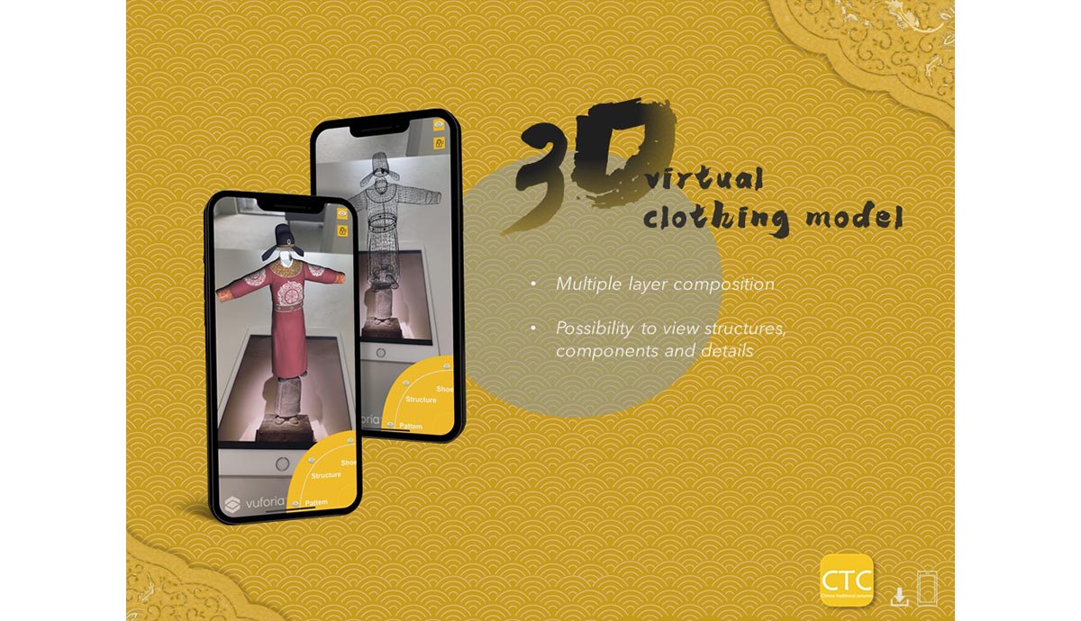 New technologies are constantly introduced in Education improving teaching and learning experiences. AR technology can bring new opportunities for teaching through multi-sensory experiences, increasing the engagement of students by combining visual environments and real objects. CTC is an AR application, developed to allow users to experience Chinese traditional clothing in a more engaging way.