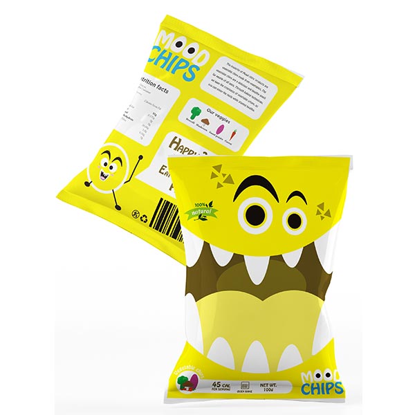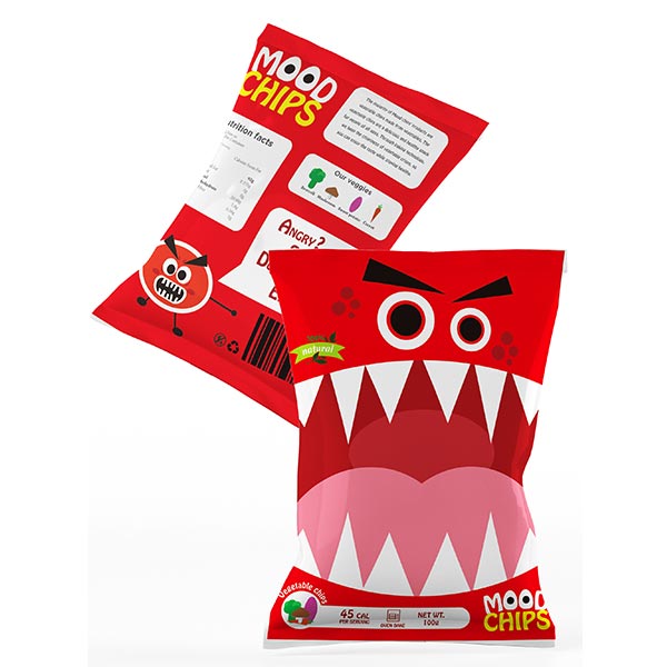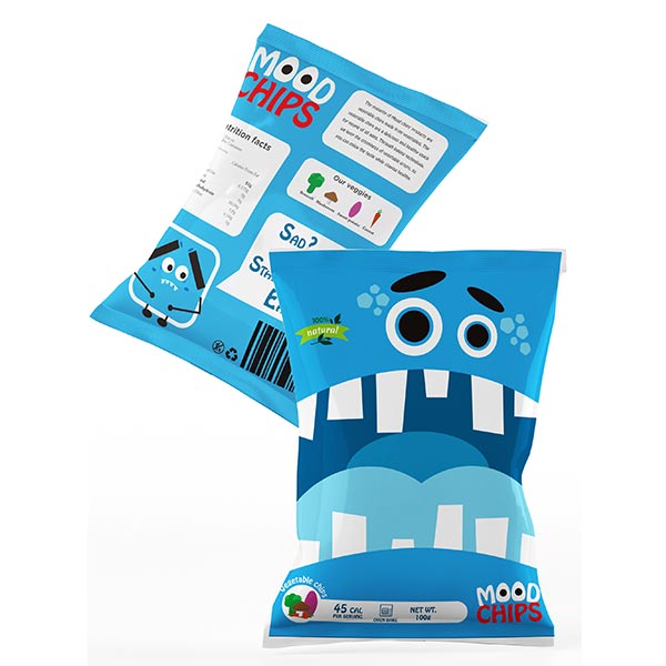 Emotional eating is becoming more common in modern life. Positive and negative emotions lead to eating behaviours detrimental to good health. Mood Chips is a new snack option designed for emotional eaters, with healthy ingredients to reduce the risks of emotional eating. Combining important packaging design features of high-calorie food, Mood Chips are designed to support emotional eaters.