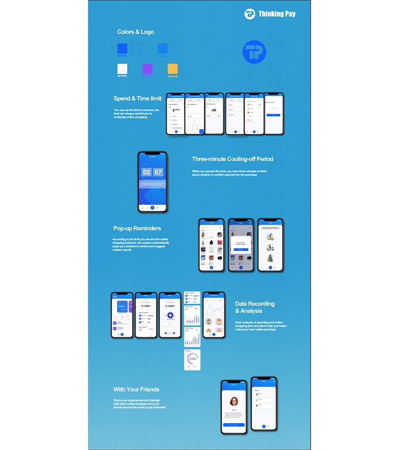 This project used online shopping addiction as a research topic, creating the app Thinking Pay as a solution. Thinking Pay is a unique application that combines online shopping and a third-party payment application platform into one. It has features to help users alleviate their online shopping addiction, reminding those who are not yet addicted to shopping appropriately.