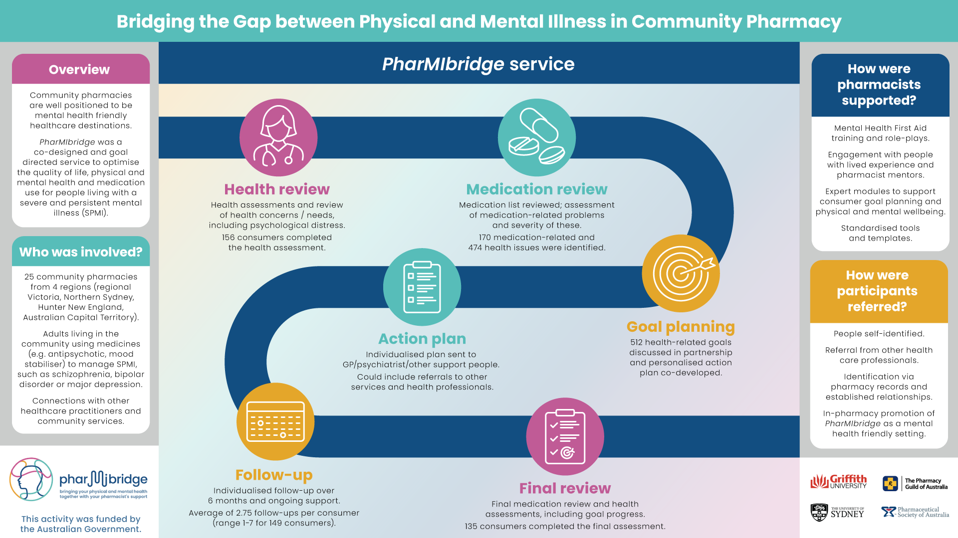 The PharMIbridge RCT tested the effectiveness of a person-centred, goal-oriented and flexible pharmacist-led support service for consumers living with SPMI, compared to a standard in-pharmacy medication review service. Changes in consumer medication adherence and health outcomes (including quality of life, physical health and mental wellbeing), as well as the confidence and knowledge of community pharmacists’ to support this population, were assessed. Additionally, the acceptability and cost-effectiveness of the new service was evaluated.