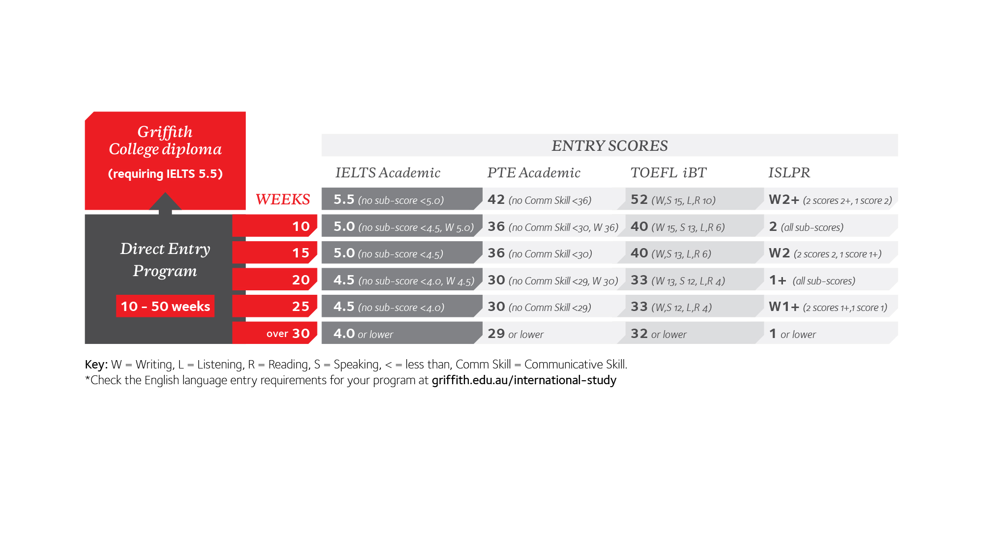 If you want to study a Griffith degree or diploma, use our guide to see how long you may need to study in the Direct Entry Program based on your current English test score.