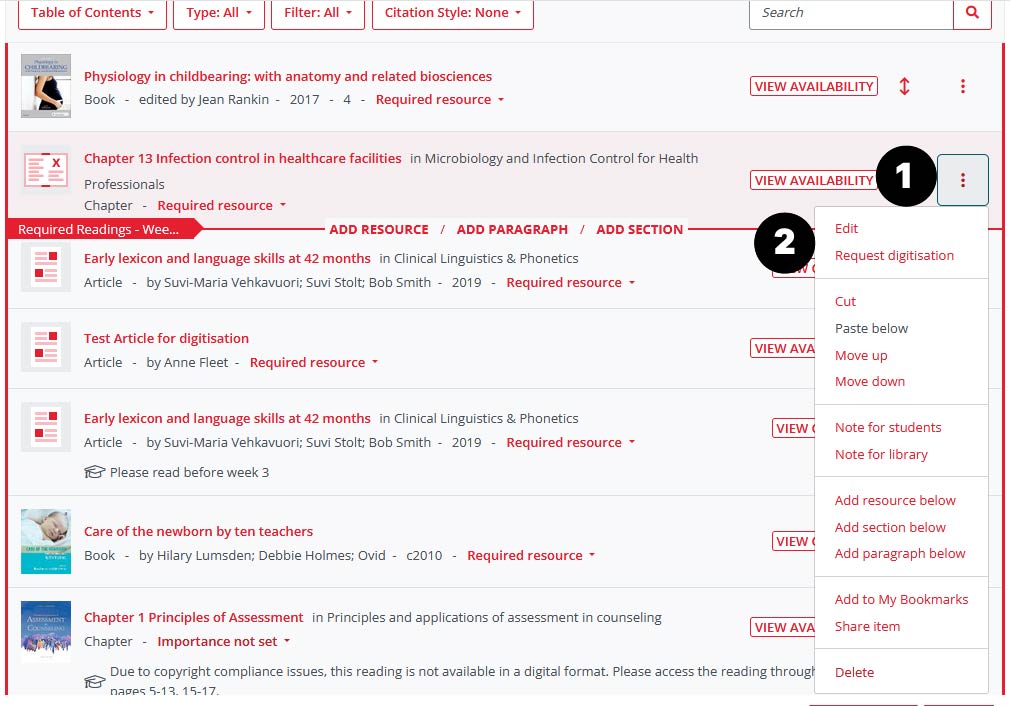 When creating your reading list you can design the style by naming the sections as required. For instance a basic style with Required and Recommended sections, or an enhanced structure listing each week's readings.
