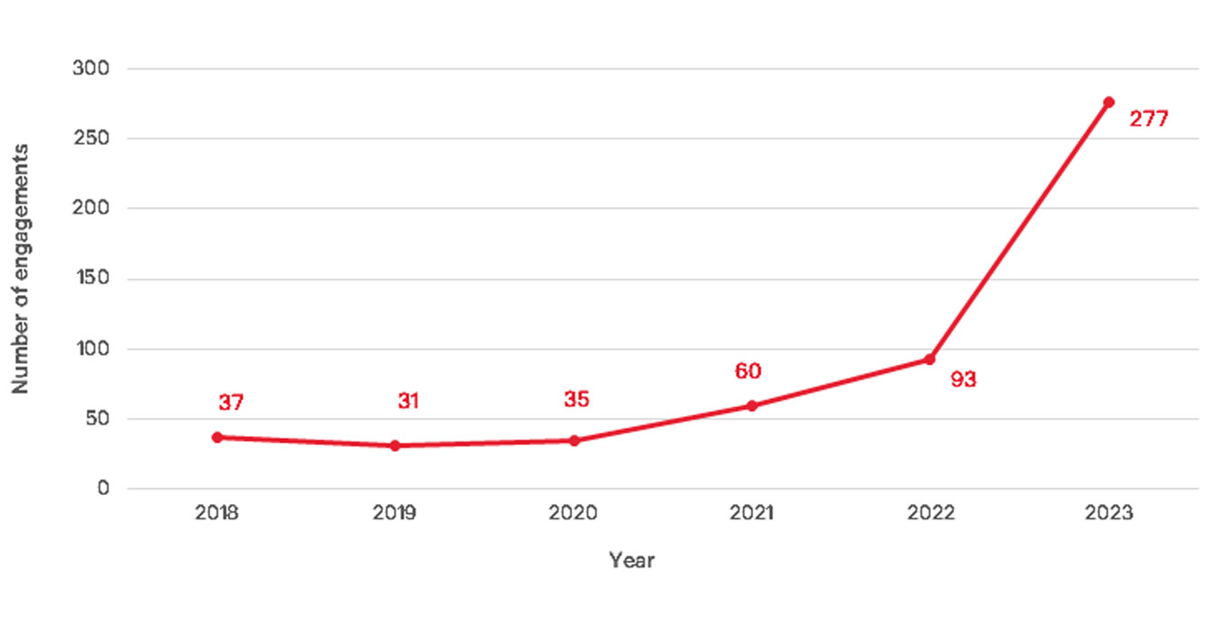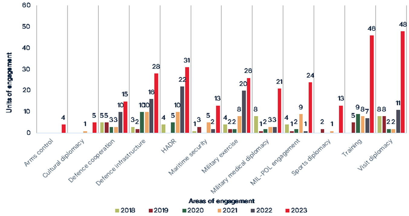 The multi-country overview is a series of charts drawn from the Defence Diplomacy Tracker that provide comparisons of various aspects of defence engagement across the five selected countries from 2018 to 2023.