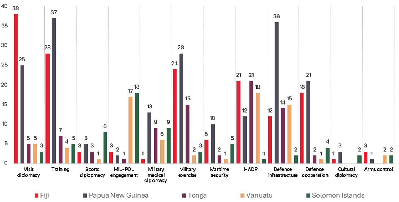 - To collect and collate data that tracks the volume and types of defence diplomacy engagement with our five target countries (Fiji, Papua New Guinea, Samoa, Solomon Islands, Tonga, and Vanuatu) over a designated period (2018-2024)