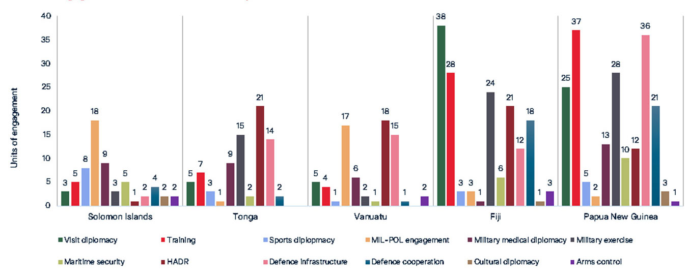- New data shows that defence engagement by China, the US, Australia and others has surged since 2018.