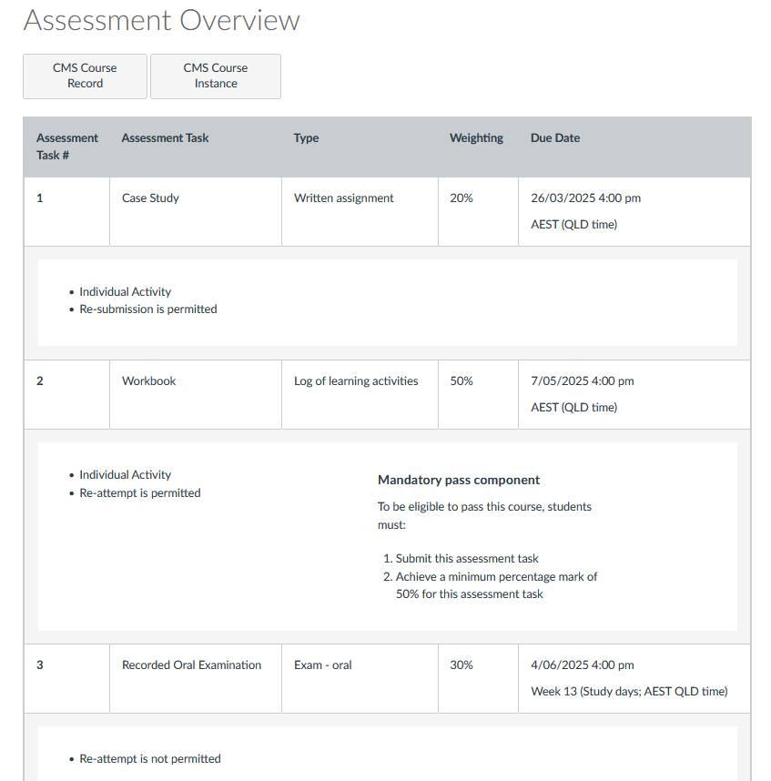 The Assessment Overview page is a single page that presents all the assessment information for the course. This includes assessment titles, due dates, information and links to support resources, policies and administrative procedures such as applying for extensions, deferments and supplementary assessments in line with the Griffith Assessment Policy.
