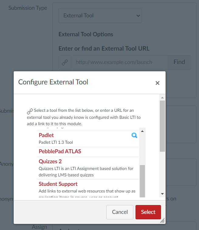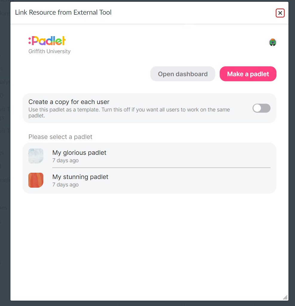 - If you’re making a Padlet, you’ll need to return to this tab and close the Link Resource from External Tool menu and open it again.
